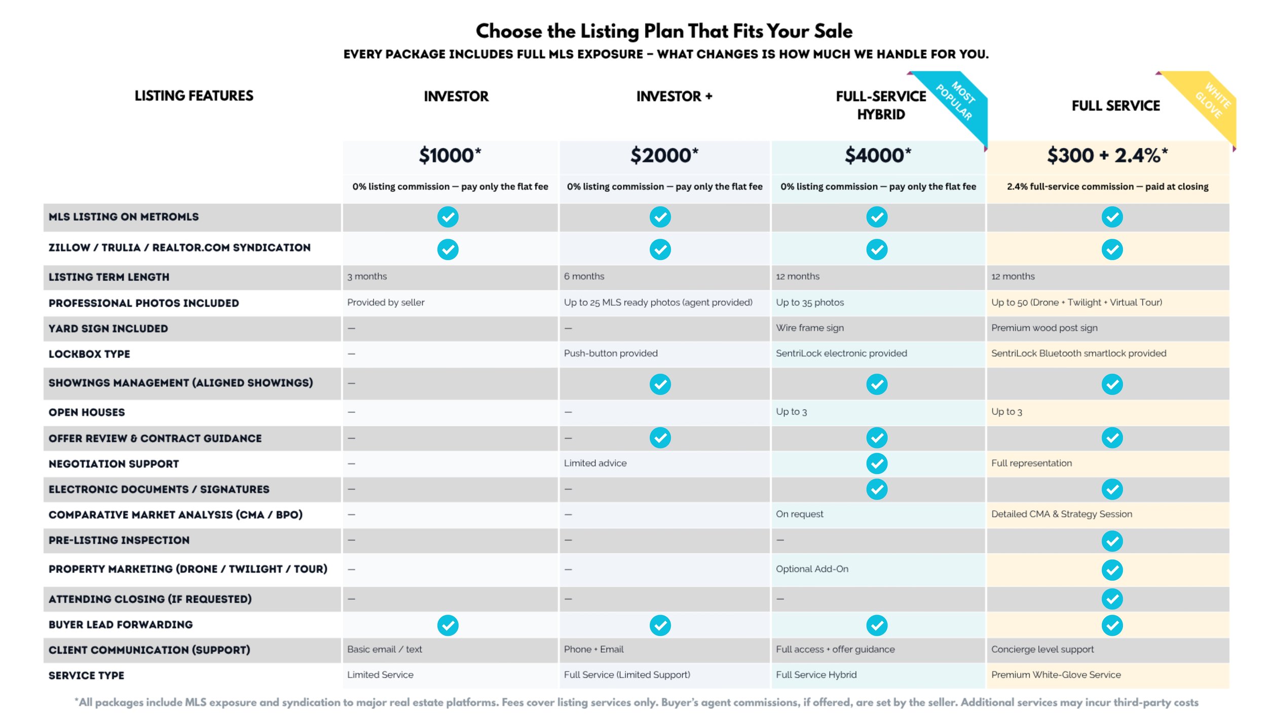Compare your options — every package includes MLS exposure, professional support, and transparent flat-fee pricing so you can keep more of your equity.
